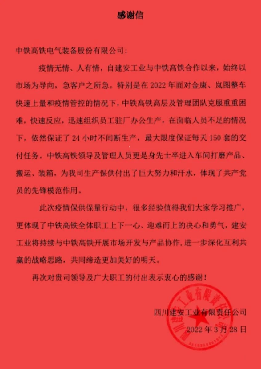 疫情無情人有情丨高鐵電氣收到一封特殊感謝信