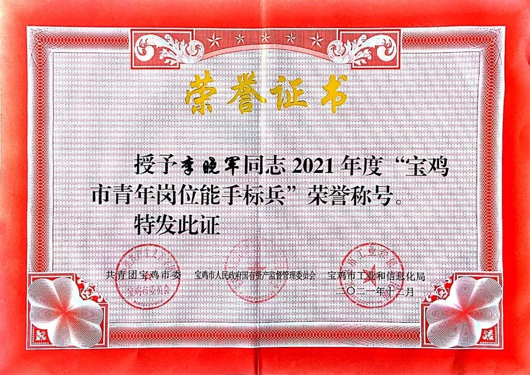 12月17日,高鐵電氣李曉軍被共青團(tuán)寶雞市委、寶雞市人民政府國有資產(chǎn)監(jiān)督管理委員會(huì)、寶雞市工業(yè)和信息化局評為2021年度寶雞市青年崗位能...