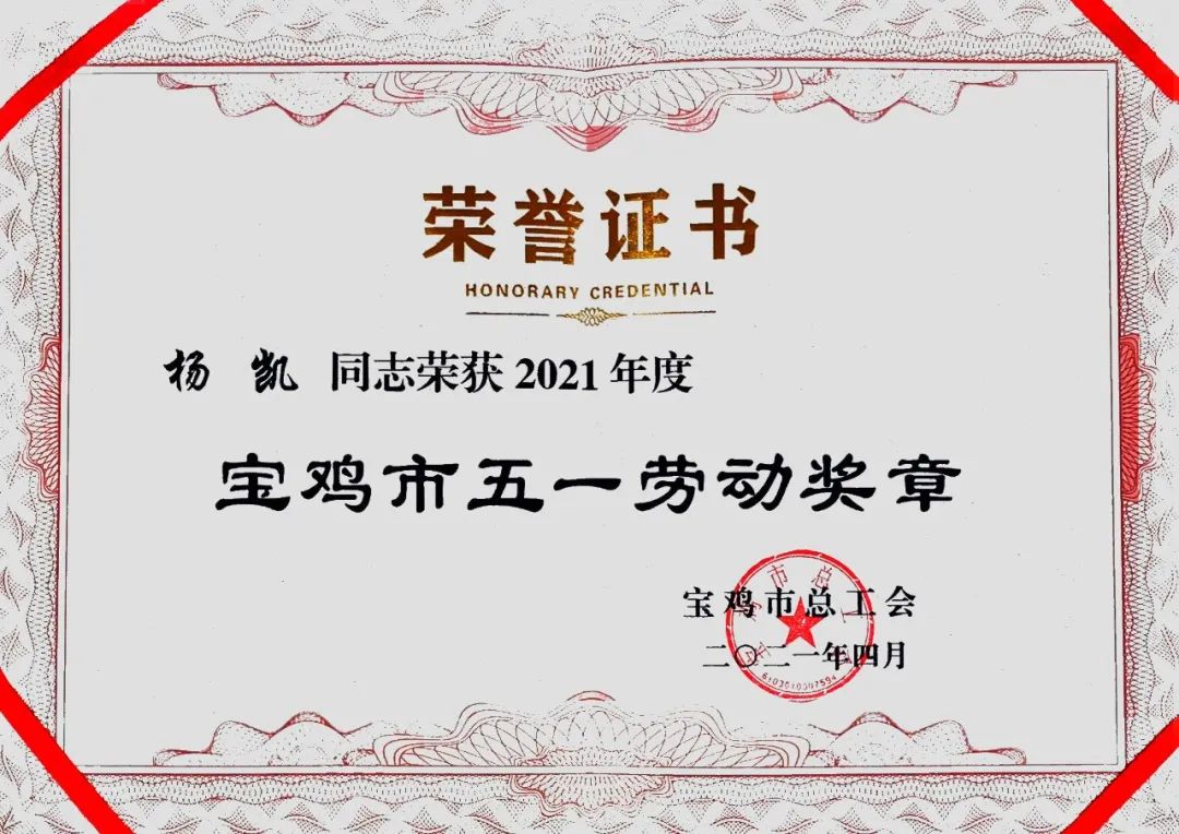 楊凱獲寶雞市五一勞動(dòng)獎(jiǎng)?wù)?/div>
